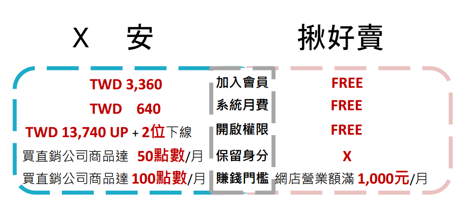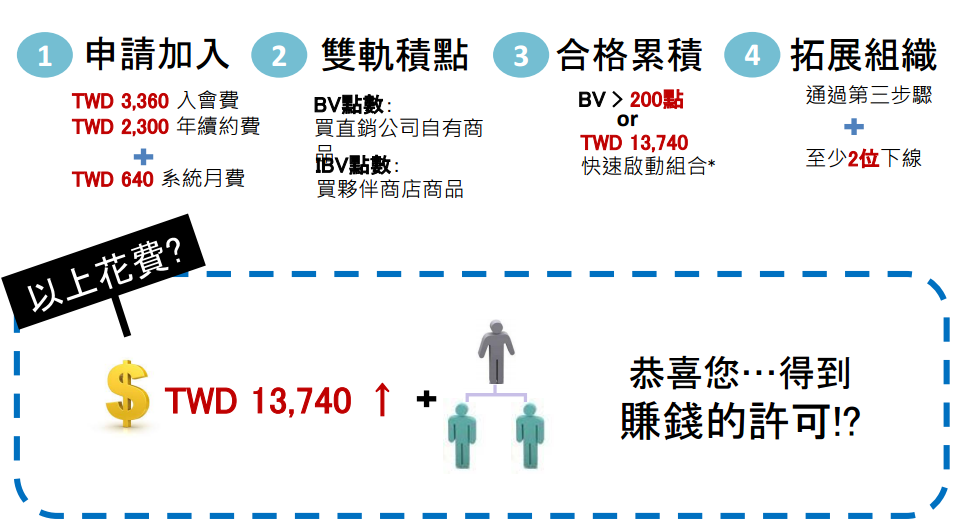 面對外界的質疑,揪好賣指出典型的傳銷模式採雙軌制。也就是賣家想在平台上獲得回饋金,一來自己要掏腰包消費「自家品牌」商品;二來要買夥伴商店產品。加上入會的會費、系統月費、年續約費,平均在傳直銷體系完成布局,要花新台幣一萬三千多元。